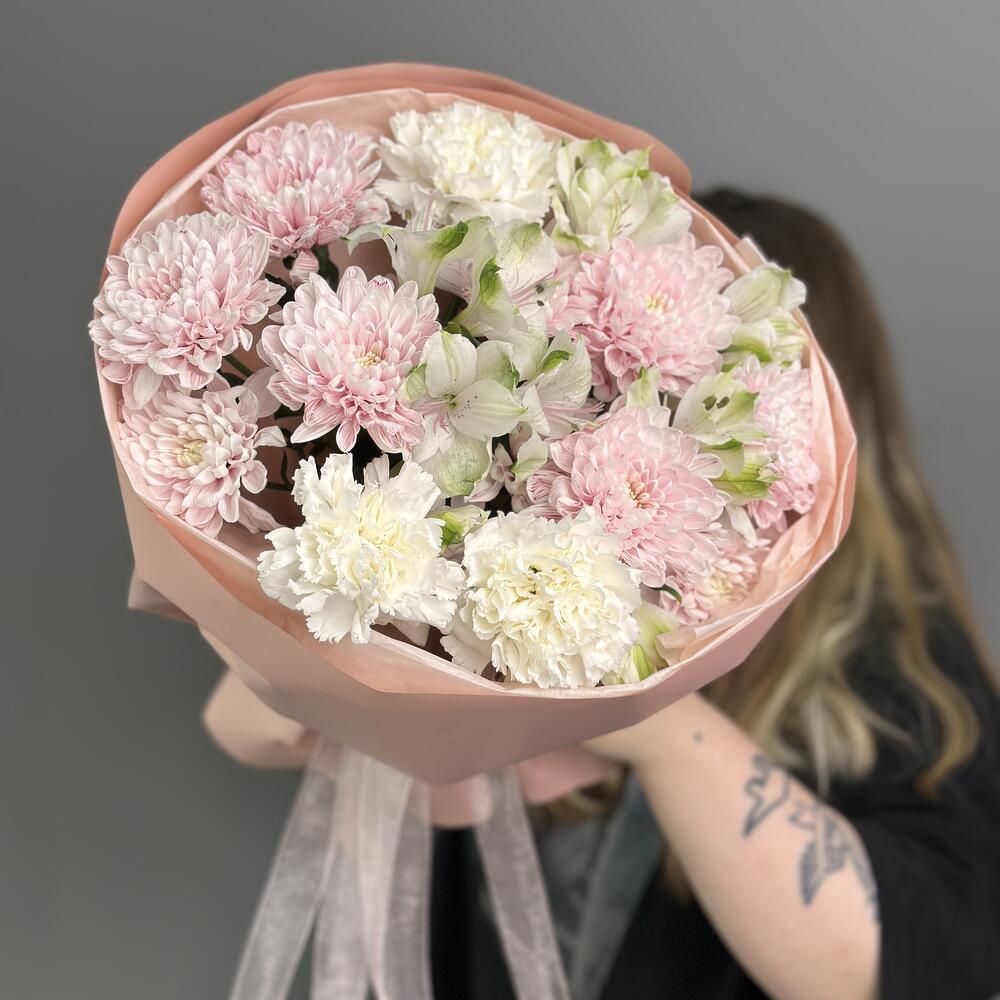В букете представлены нежная хризантема в розовом цвете, которая идеально дополняется нежными альстромериями в белом цвете 😍 Каждый цветок был осмотрен и отобран с большой тщательностью, чтобы гарантировать максимальное качество и долговечность🥰